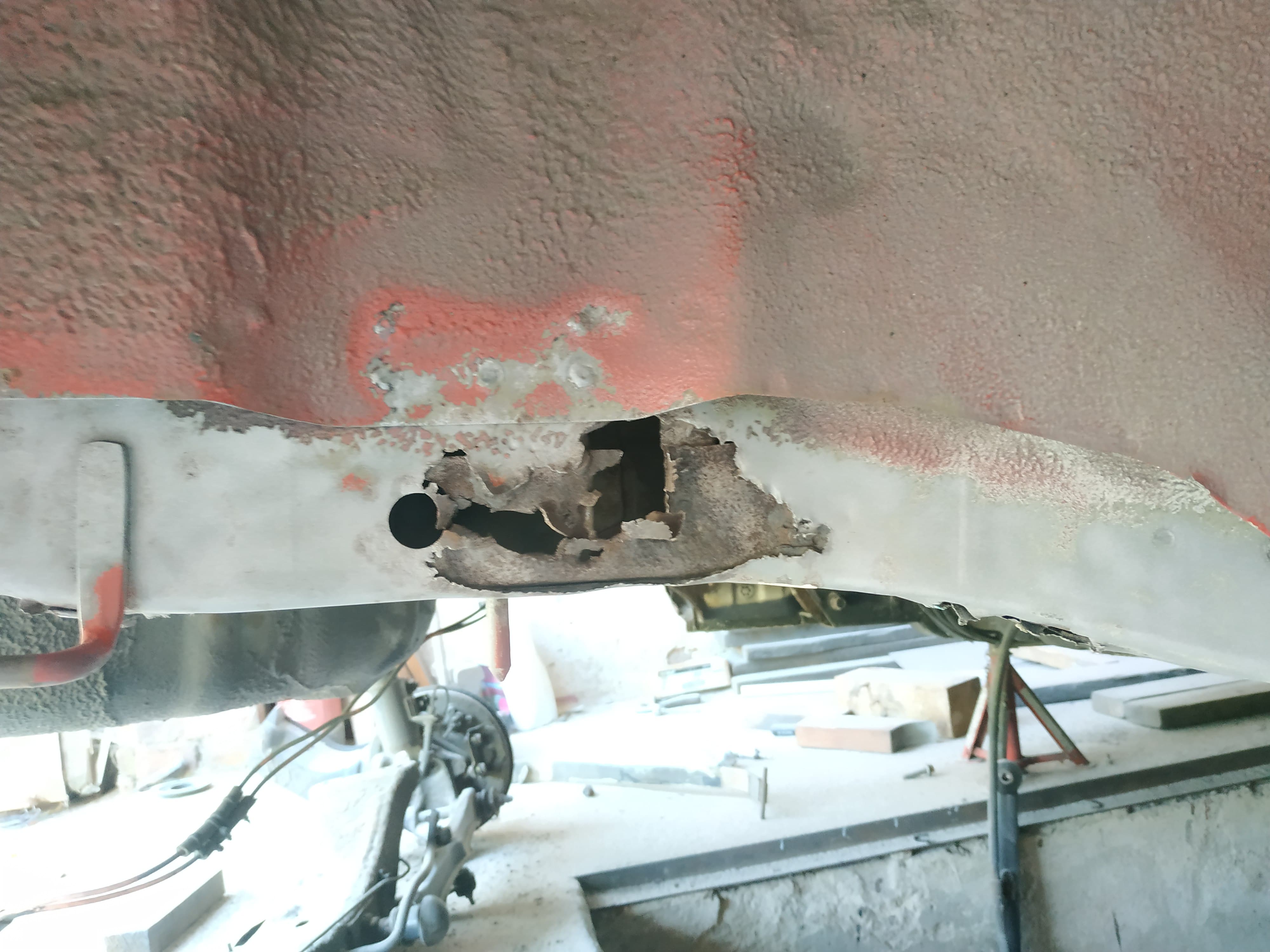 Z prawej podłużnicy zostało wyciętych 5 dużych dziur, pojawiły się takie, które ktoś wcześniej zaszpachlował, perfidnie ukrył albo do przeglądu albo przed sprzedażą.
