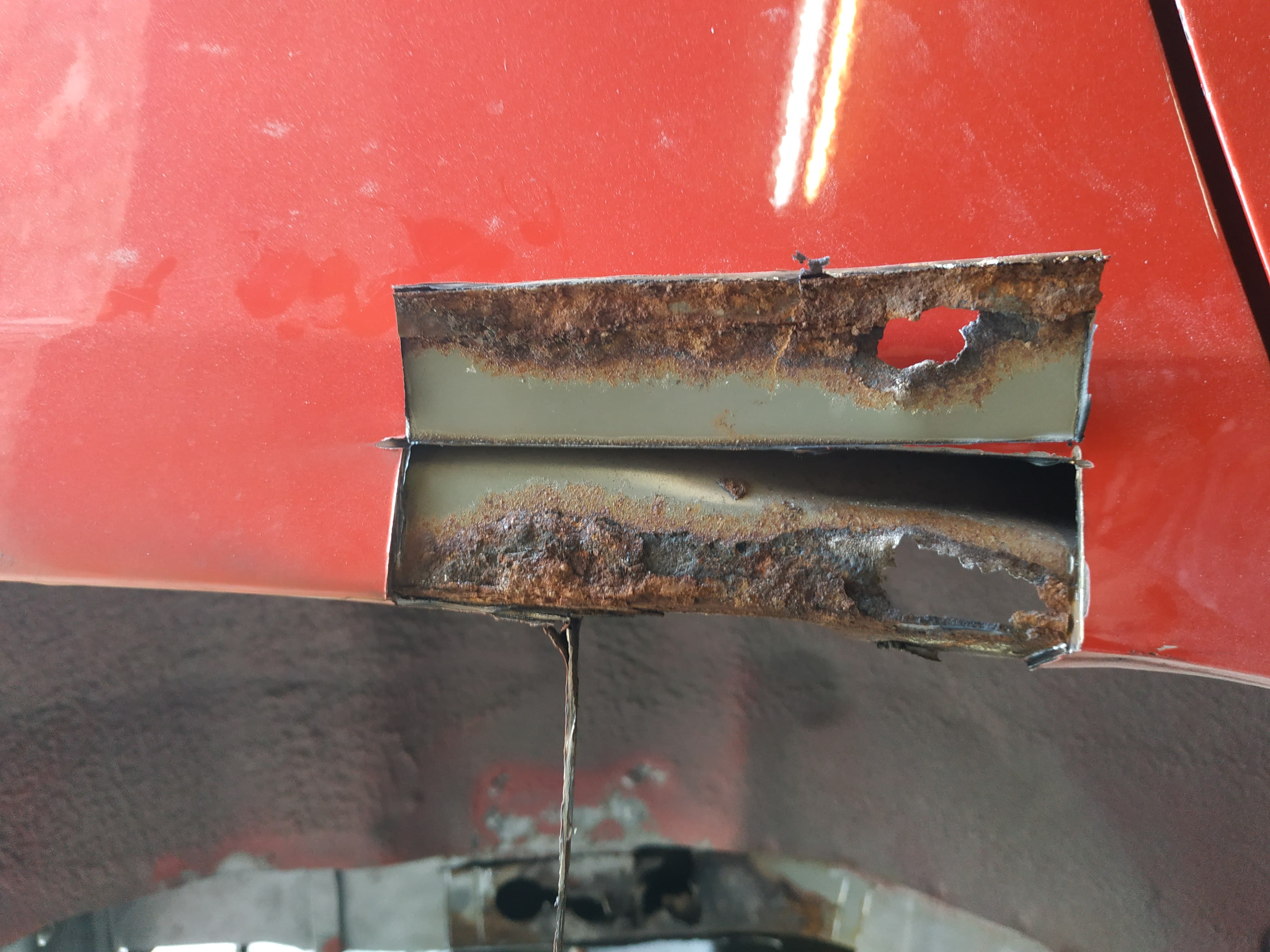 Wracając do czerwonej F-ki, jeśli jest tylko tyle dziur, to dobrze. Przy takim zakresie prac warto zdjąć starą masę natryskową z całego auta, po tylu latach na pewno straciła swoją elastyczność, można wypiaskować, byle nie zedrzeć za dużo fabrycznej kataforezy. Nie będę się rozpisywał na temat szczegółów, wykonawca który stosuje podkład spawalniczy z reguły wie co robi. Przy takim zakresie prac, warto zamiast klasycznej konserwacji zastosować masę natryskową, taką jak używana przez producentów przy produkcji karoserii, może być Sika, Forch, cokolwiek... a do profili zamkniętych porządny wosk.