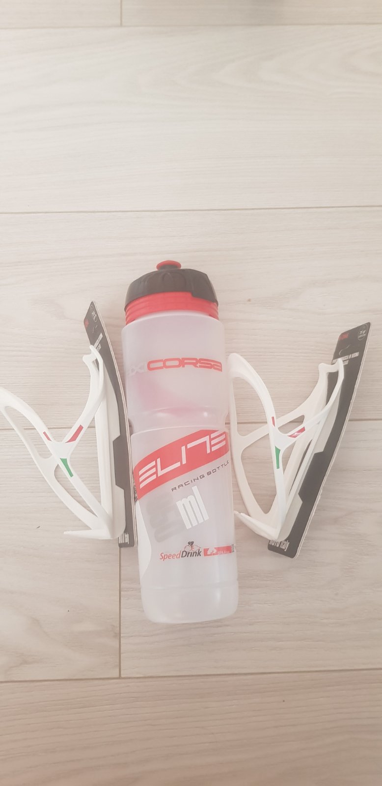 Uchwyty na bidonu, białe, bardzo lekkie (25g) i z flaga Italy <serduszka> + bidon Elite 950ml (kilka innych bidonów Elite już mam, wiec kupiłem tylko 1, dużej pojemności