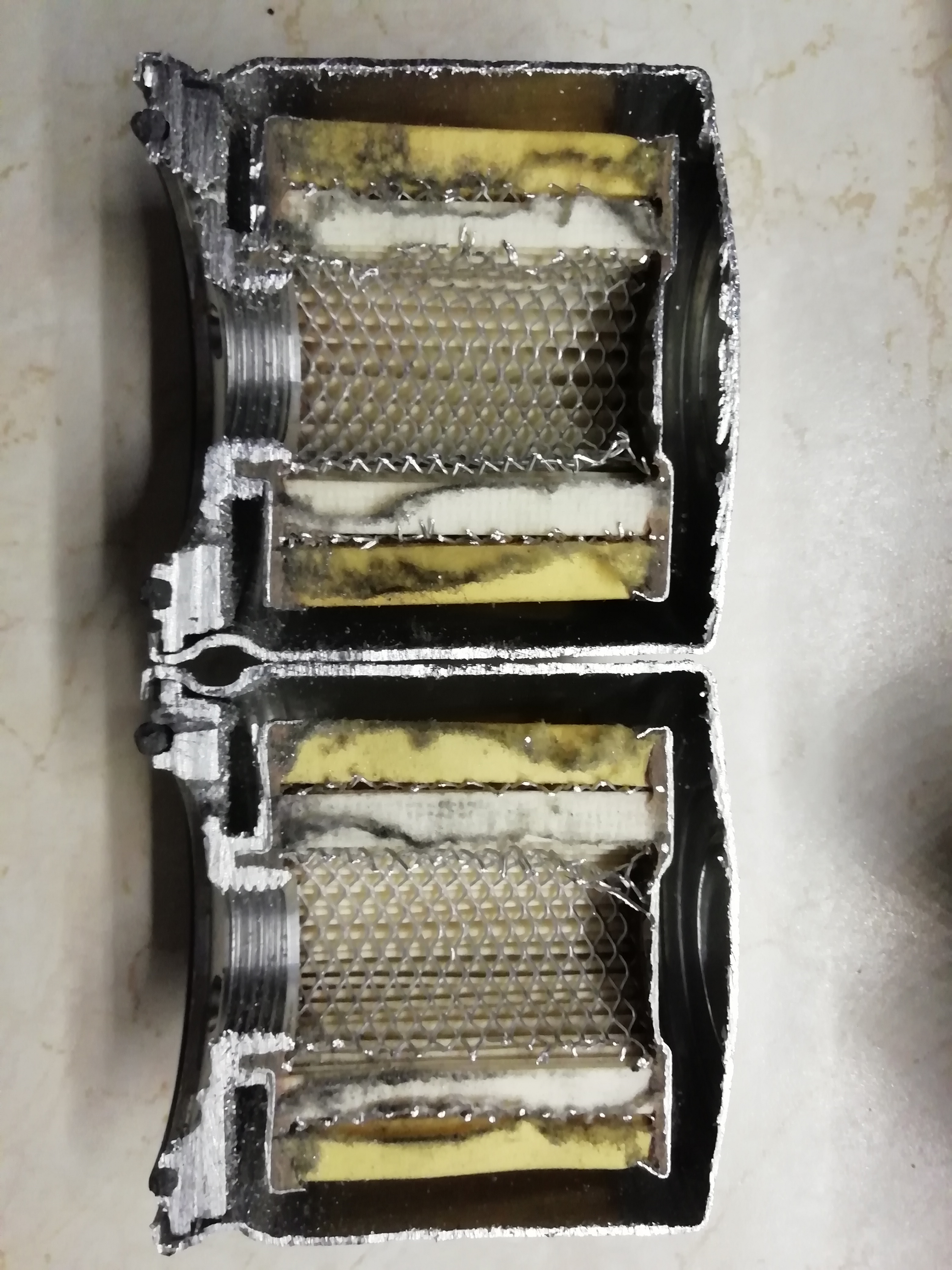 Warstwa filtrująca jest 2 częsciowa. Bibuła i poliester. Generalnie filtr był czysty a te szare naloty to brud od krojenia piłą. Opiłki metalu poprzyklejały się tam, gdzie puszka zgromadziła substancje oleiste.