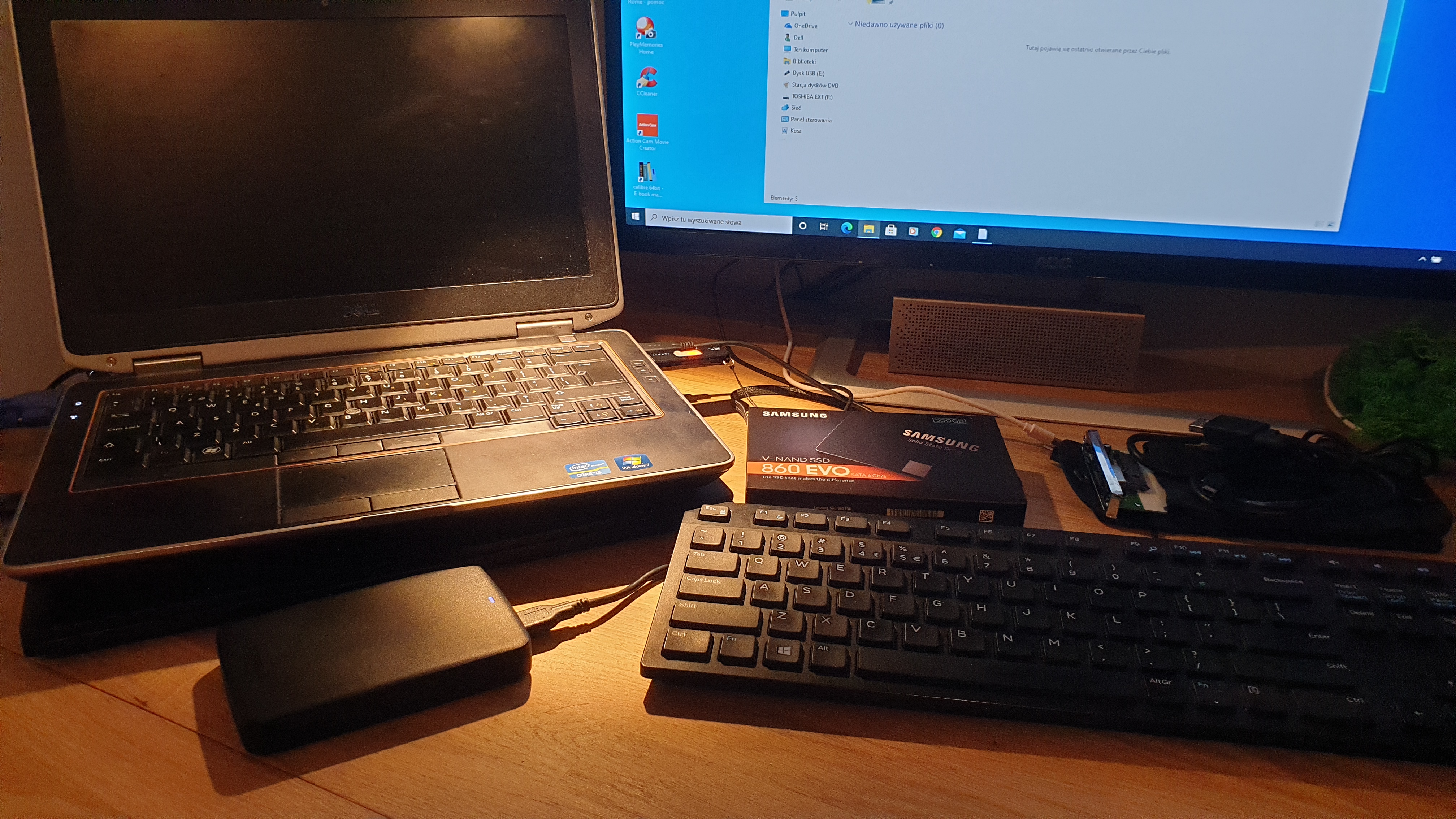 Monitor rocznik 2010, Dell Latitude E6320 podobnie, stacja dokująca starsza od węgla, do tego klawiatura i mysz po programiście – wszystko Dell :D. Trochę wyślizgane, ale nie jest jeszcze bardzo rozklekotane – to jest jakość! Początkowo był mlodszy Logitech, ale jednak był gorszy.