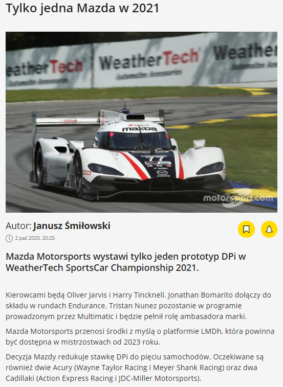 Właśnie odpaliłem sobie Eurosport 2 na wyścig Daytona 24 i na drugim polu startowym widzę prototyp z logiem mazdy :D . Mazda DPi