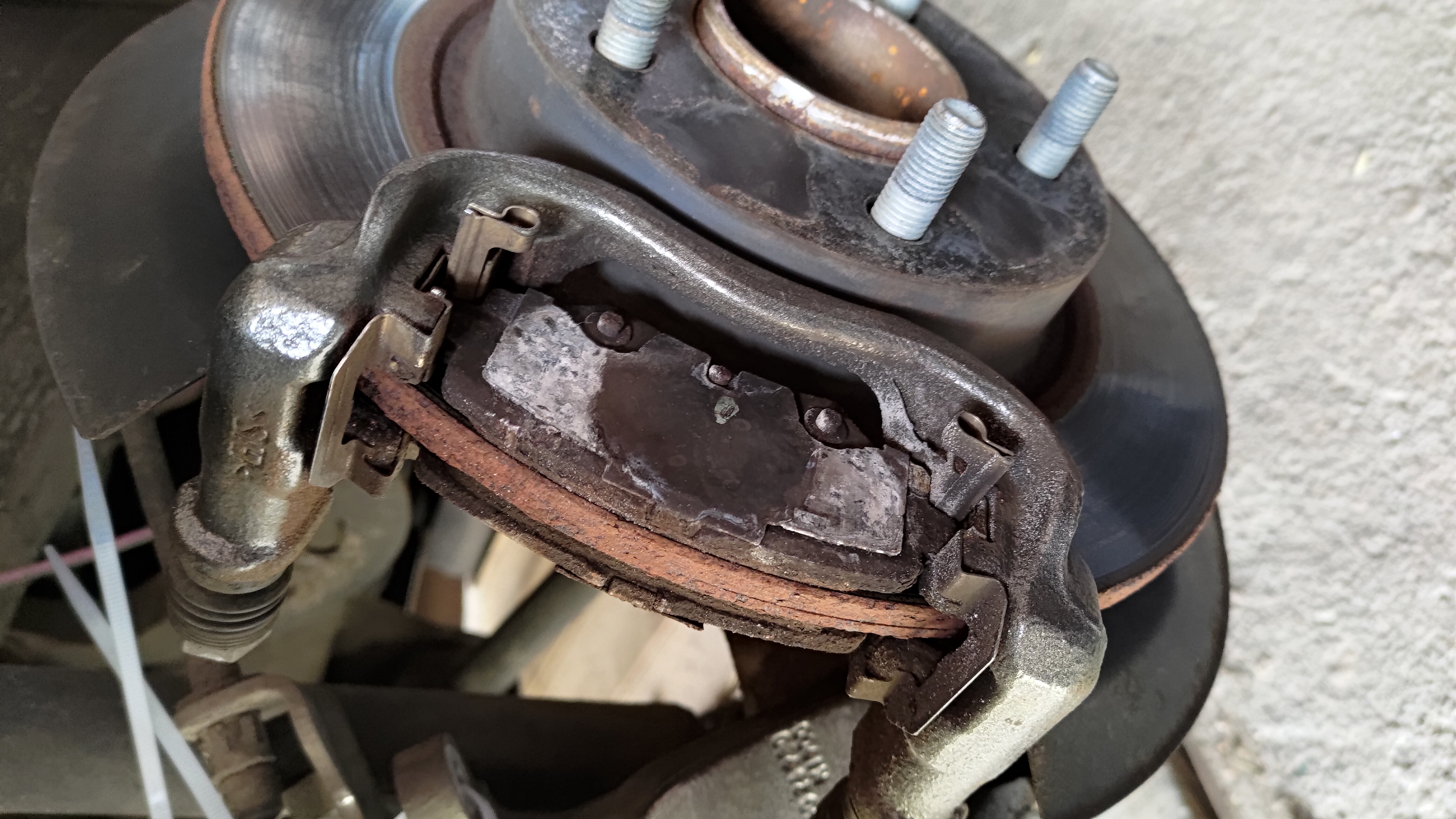Po rozebraniu hamulca ujrzałem jeden wielki syf – pełno zastałego od nieruszania pyłu i brudu. Prowadnice jak i ich tuleje w jarzmie nie wykazywały śladów zużycia, tak samo ich gumowe osłony. Przy szarpaniu zero dźwięków, więc tak jak obstawiałeś Child winowajcą były prawdopodobnie zapuszczone tarcze i klocki (same klocki musiałem wybijać z blaszek gumowym młotkiem bo za nic nie chciały drgnąć). Z drugiej strony poszło dużo szybciej – brudu było znacznie mniej, a same klocki swobodnie dały się wycisnąć z jarzma palcami. Poniżej parę zdjęć z wymiany.