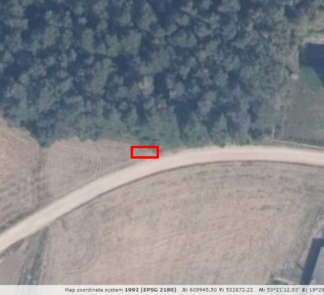 Auto zostało zaparkowane dokładnie w miejscu, które widać na załączonym zdjęciu (jakieś 0,5 metra od krawędzi). Jest to lekki zakręt, a miejsce położone jest dosłownie na "końcu świata". Droga jest utwardzona, posypana tłuczniem, który był już rozjeżdżony. Wnioskując po fakcie, że największe uszkodzenia są na wysokości ~1,2m, to nawet gdybym samochód pozostawił kilka metrów od drogi, to kamienie mogły by dolecieć. A miałem tego dnia wziąć stare auto... Ech...