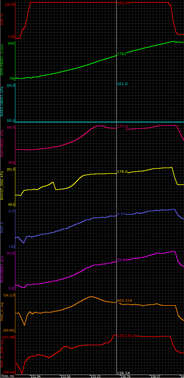 Zrobiłem pomiary Forscanem w sytuacji równomiernego przyspieszania na 2. biegu przy pełnym wciśnięciu pedału przyspieszenia (APP). Wnioski: