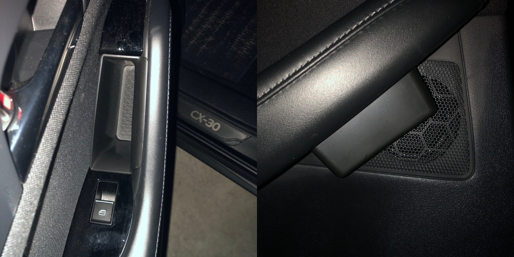W poprzednim aucie miałem pojemniki w uchwytach drzwi. Siła przyzwyczajenia jest duża, więc w Maździe zdarza się, że różne drobne przedmioty przelatują przez otwór i wpadają do kieszeni w drzwiach. Zamówiłem więc mini kieszenie, które dość łatwo wchodzą w uchwyty drzwi. W czasie jazdy (na razie) nie hałasują. Komplet w tylnych drzwiach wychodzi poza obrys uchwytu, ale i tak z tyłu nikogo nie wożę, więc z powrotem wyląduje w pudełku. Tutaj tylko dla pokazania, jak to wygląda. Plus jest taki, że przy zamykaniu tych drzwi od wewnątrz, nie grozi nam złamanie paznokci.