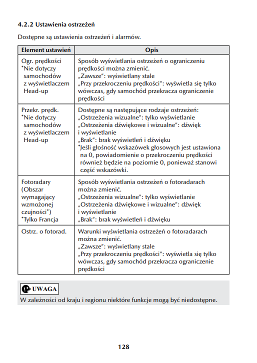 – Ostrzeżenia i fotoradary – ostrzeżenia wizualne, ostrzeganie dzwiekowe i wizualne oraz brak.