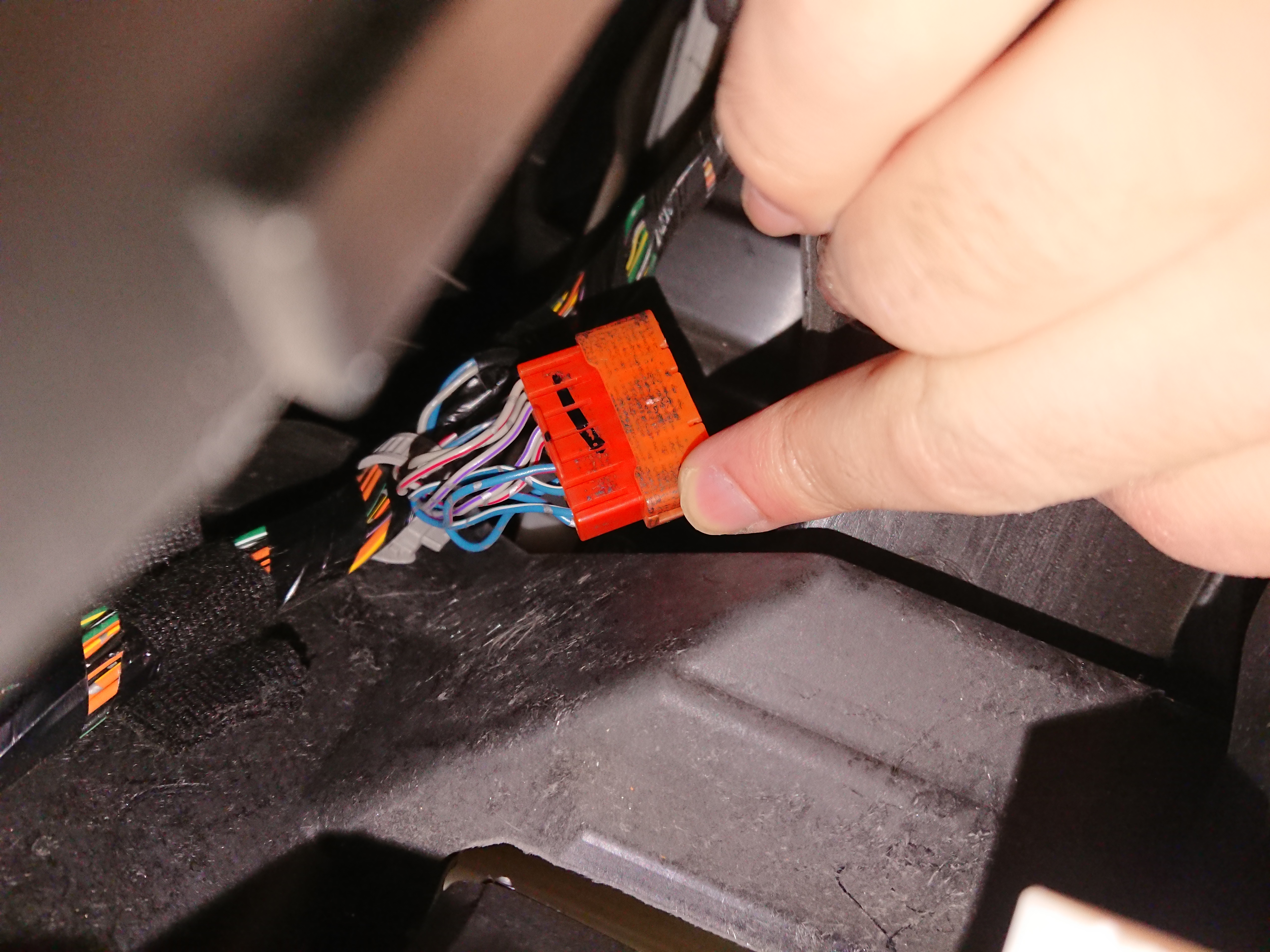 Pozostaje podprowadzić kabel z dużej, niebieskiej wtyczki od puszki bezpieczników (wtyczka od góry ECU) do przełączników i później od przełączników do tej kostki koło nogi pasażera żeby napięcie mogło iść już do foteli.