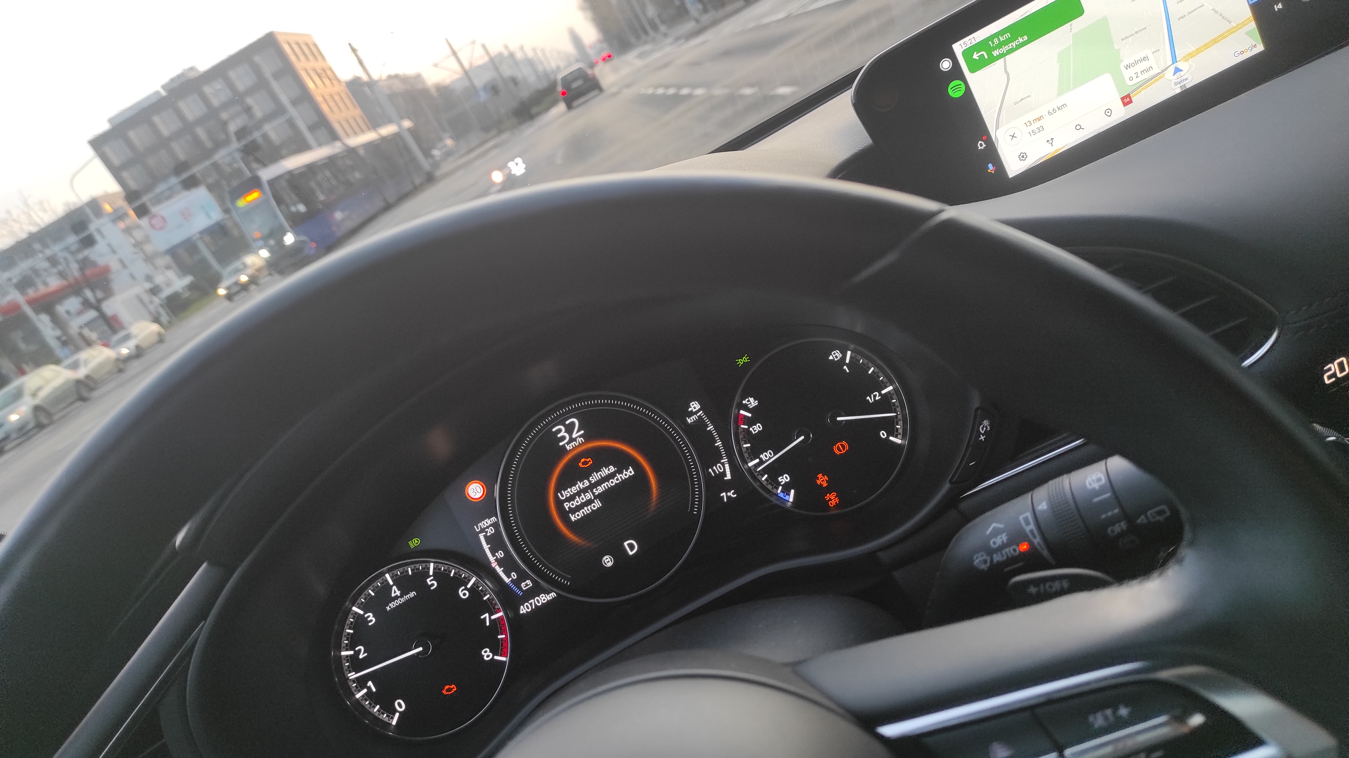 Pacjent to mazda 3 150 KM automat, 2020 rocznik, 40kkm przejechane. W ciągu ostatnich kilku miesięcy trzykrotnie zdarzyło się, że auto zgasło na postoju pod światłami i po odpaleniu ponownym wyświetlony był komunikat "usterka silnika poddaj samochód kontroli'. Pierwszy raz było to ok. 6 kkm temu, drugi 100 km temu, trzeci dzisiaj. Dzisiaj dodatkowo zapaliła mi się choinka na desce – zdjęcie załączam.