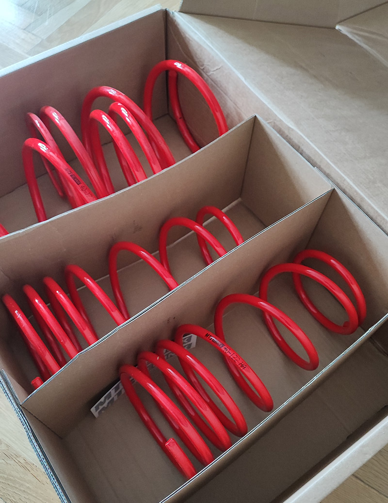 Dotarły nowe sprężyny. Zmieniam z H&R które są bardzo twarde (na tor, super) na MTS Technik. Podobno nadają się lepiej do codziennej jazdy. Zobaczymy. Obniżenie takie same -35mm. Pasują też pod kolor nadwozia ;–).