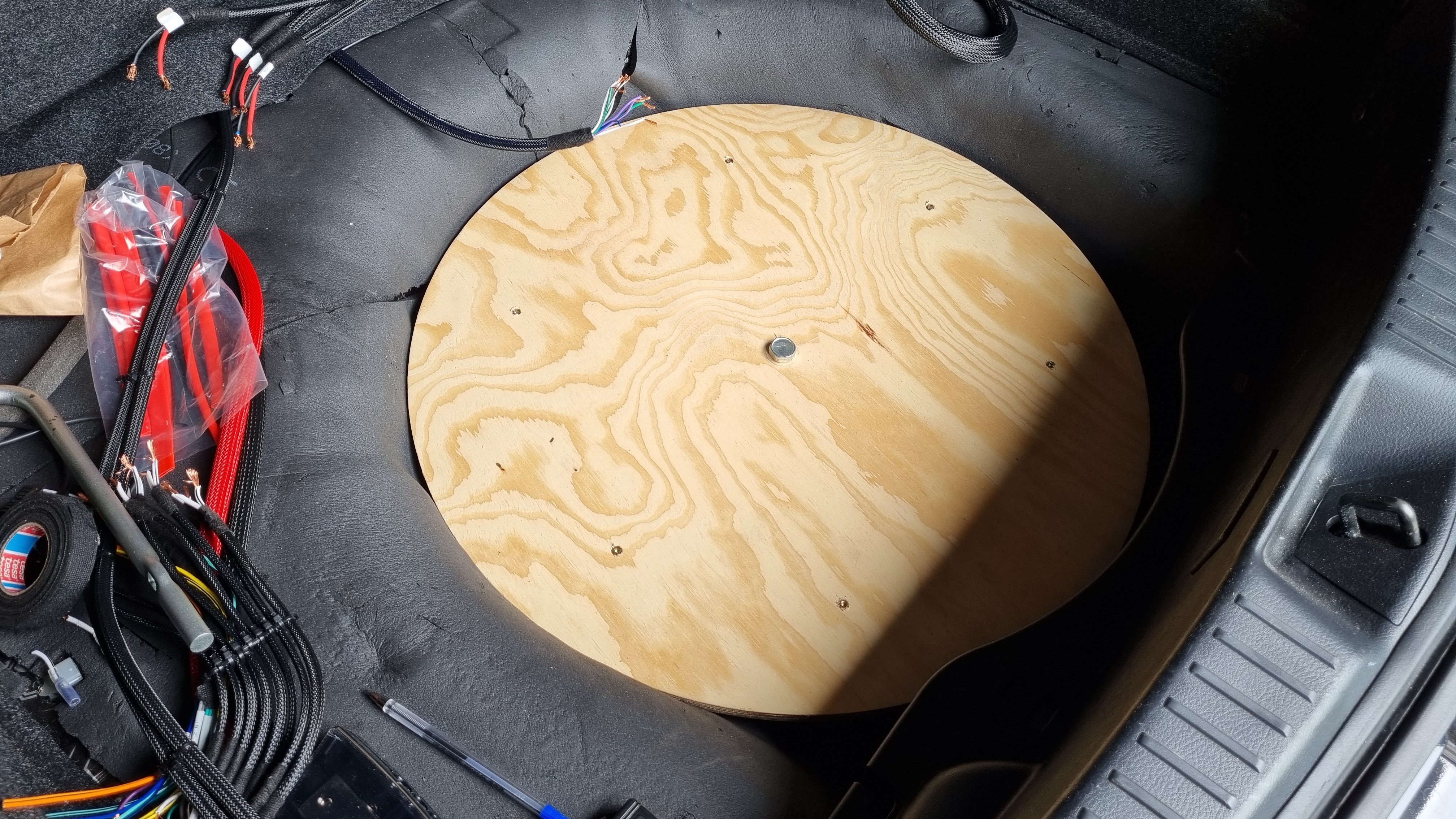 W bagażniku chwilowo panuje straszny bałagan. Ostatecznie wejdzie okrąg 60cm z sklejki wodoodpornej w miejsce koła zapasowego i na tym będzie cały sprzęt przymocowany. Wstępnie tylko audison af c8.14 bit zasilający wszystkie głośniki plus dodatkowo subwoofer re audio s10r4. Ostatecznie na przód trafią nowe głośniki zasilane aktywnie z audisona plus fabryczny tył plus może monoblok na zasilanie re audio.