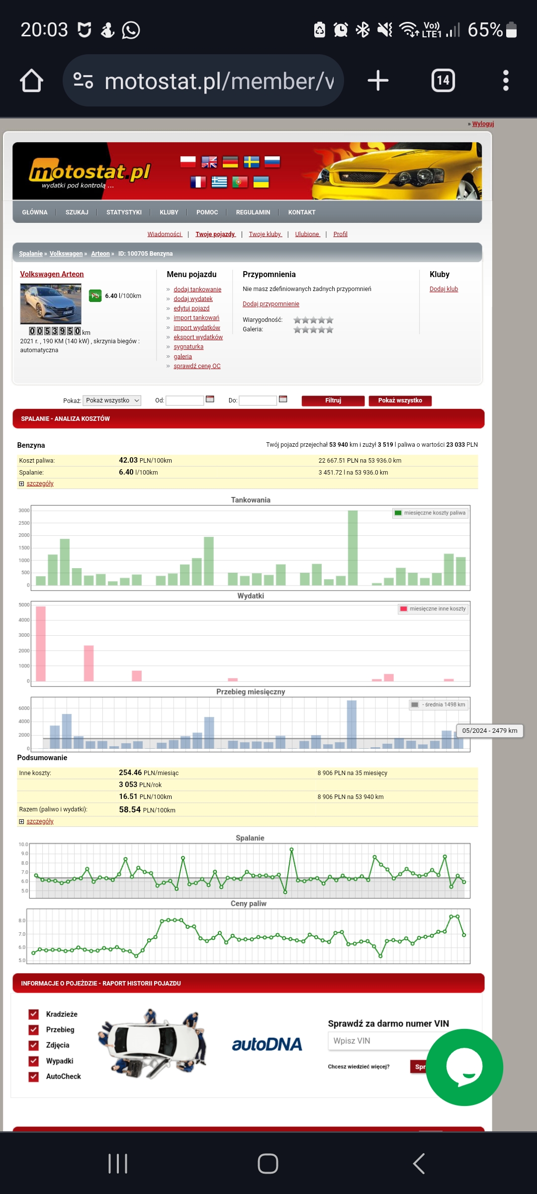 3787 km, średnie zużycie paliwa 6.0 l/100 km, średnia prędkość 92 km/h :)