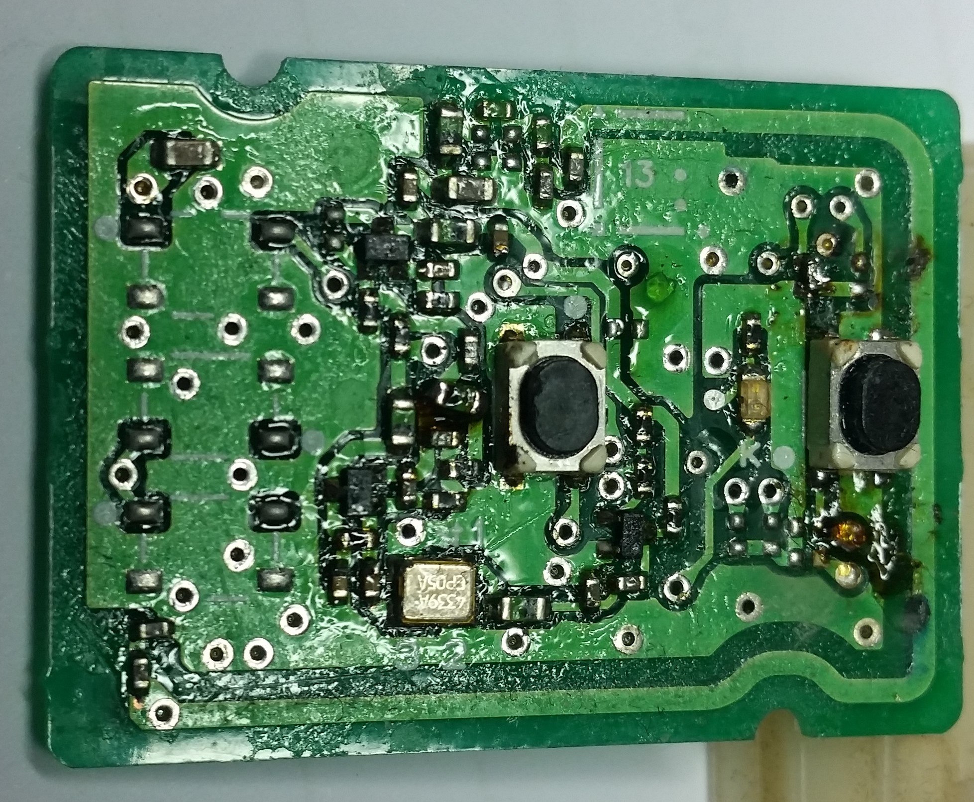 Jeden – pewnie padnięta płytka, w drodze już zamiennik z Ali. Ale w działającym chciałem zamienić sobie obudowę, bo po prostu połamały się przyciski. Najpierw – obudowa jest gówniano spasowana, musiałem przełożyć ze starego oryginalną blaszkę do uchwytu breloka, bo nie dało się zamknąć pilota. Potem zaczęły się jazdy, że pilot raz zaskakiwał, raz nie i w końcu klęknął.