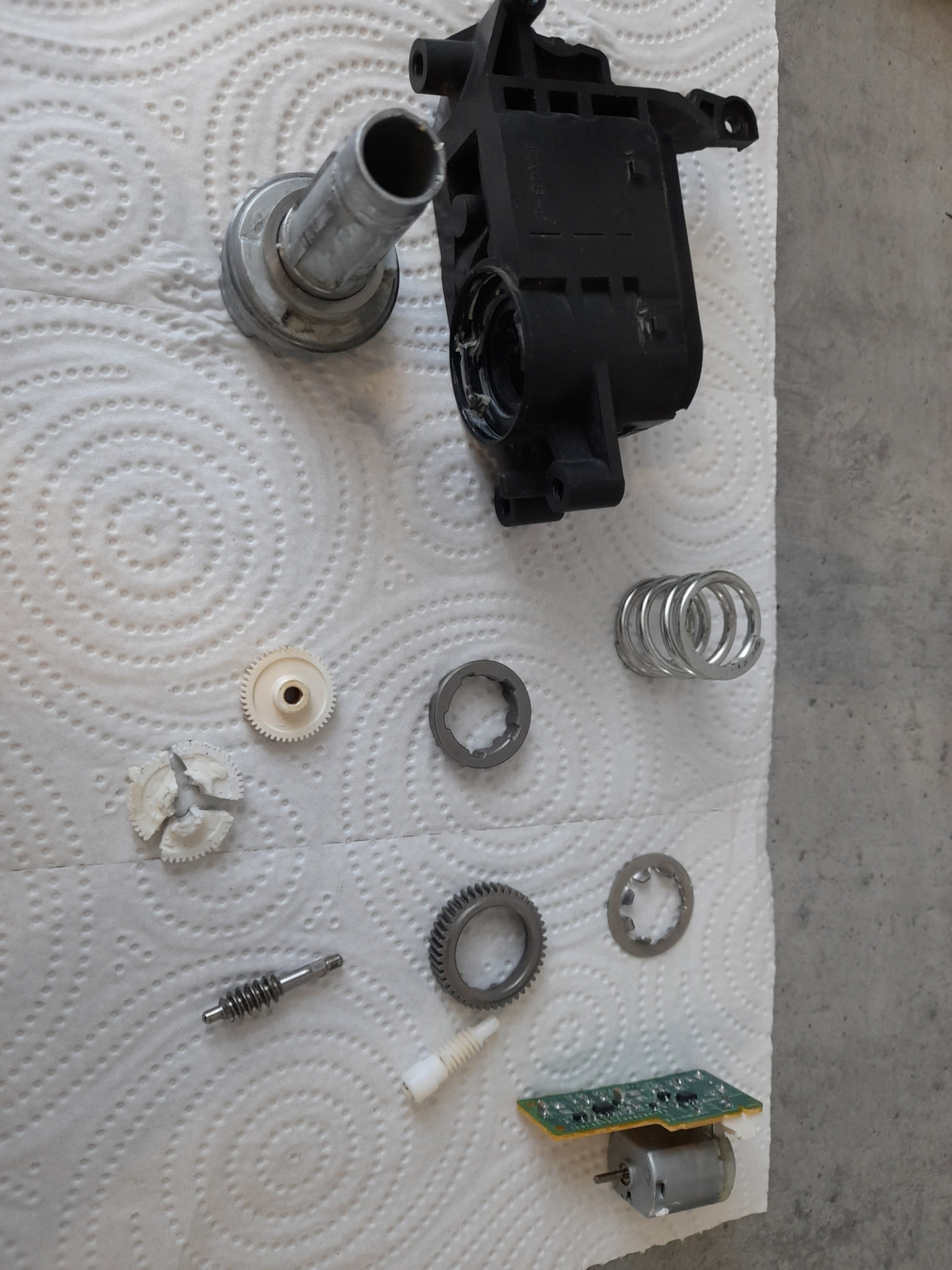 Typowa usterka- uszkodzone kółko zębate napędu. Objaw brak reakcji na przycisk składania lusterek oraz głośne dźwięki silniczka w środku lusterka.