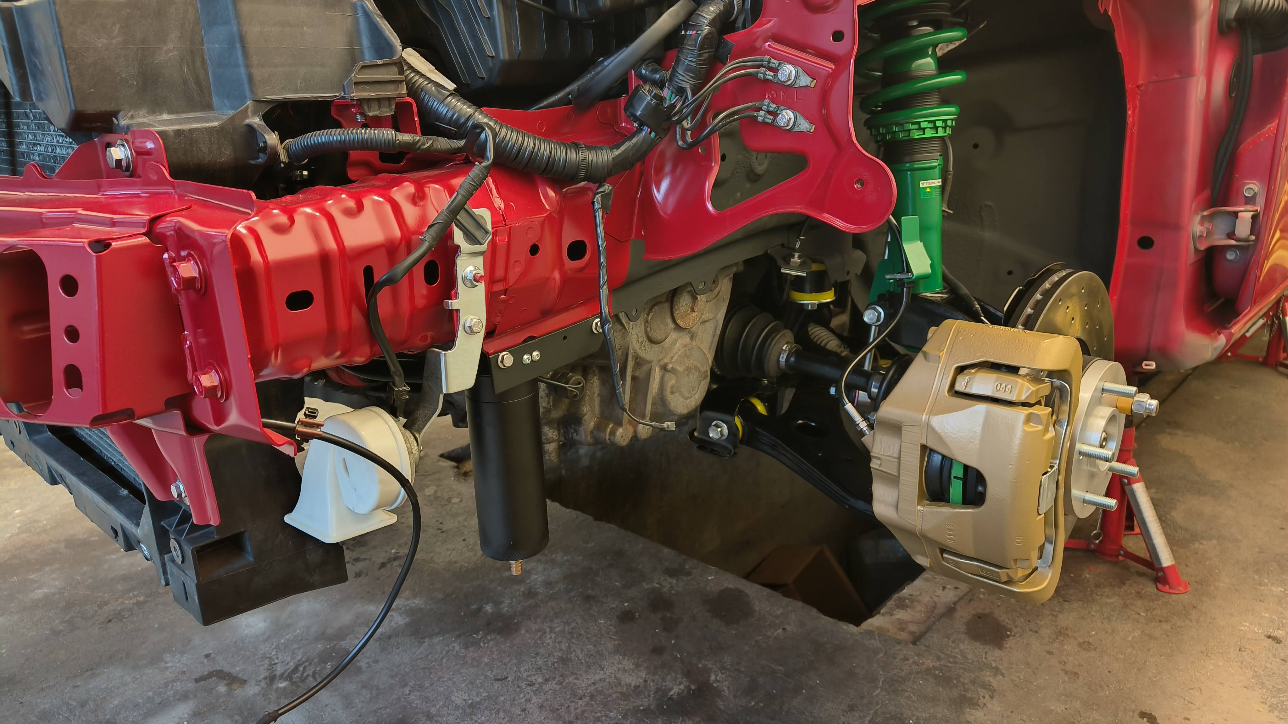 Po skrzyni czas był zająć się korozją na podłużnicach i nadkolach z przodu. Wszystkie oznaki rudej rozszlifowane, zamalowane podkładem, na to na grubo poszedł lakier i klar. Podobny zabieg przeszła przednia belka – już raz ją ściągałem wcześniej ale wtedy tylko największe babole rdzy były usunięte i zamalowane a teraz poszła w całości w lakier. Po polakierowaniu i pomalowaniu nadkoli można zacząć montować komponenty wszystkie na gotowo. Wpadły wszytkie seryjne części a dodatkowo zamontowany został Oil Catch Can.