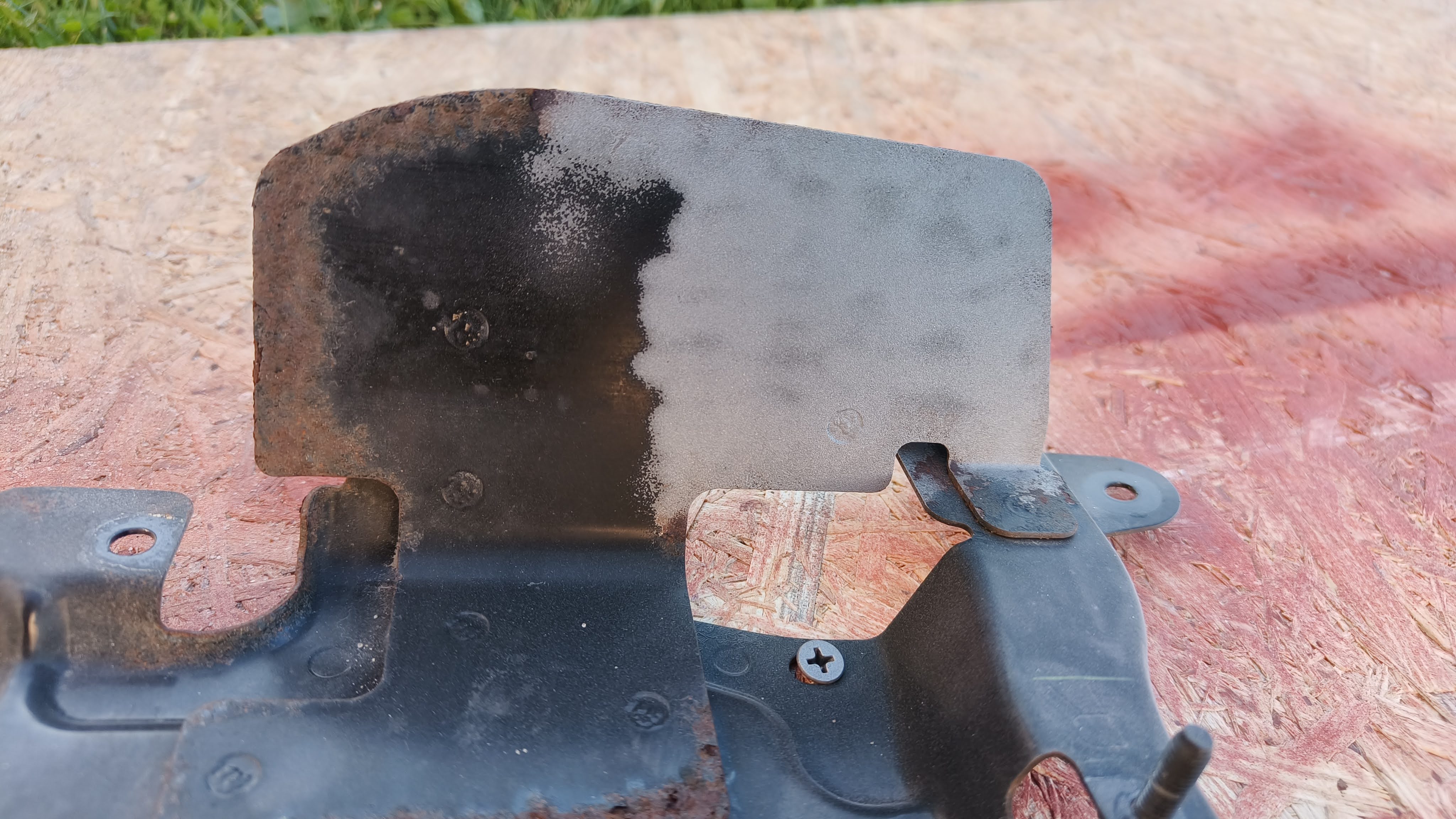 Tymczasem regenerujemy ostatnie elementy – po ściągnięciu zderzaka kilka blaszek wymagało ratunku i chciałem na nich zrobić eksperyment z domowym piaskowaniem z użyciem lekko zmodyfikowanego pistoletu do przedmuchiwania. Eksperyment uważam za udany – patent świetnie nadaje się do takiej drobnicy, idealnie w każdy zakamarek sięgnie i sporo czasu oszczędza w porównaniu ze szczotką drucianą