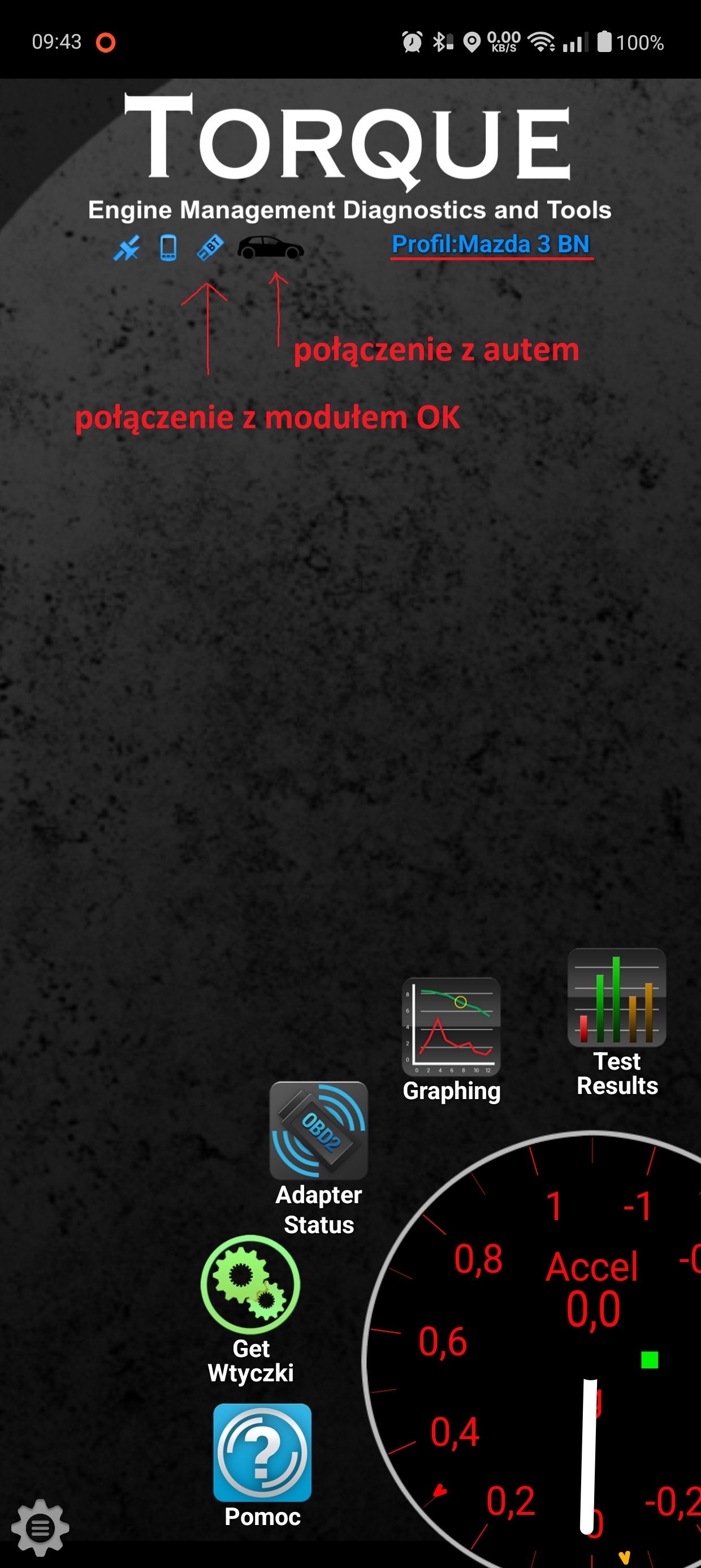 Jeśli wszystko pójdzie OK na ekranie głównym jest status połączenia z modułem i samochodem – na samochód trzeba chwilę poczekać ale jak się podswietli ikona samochodu wszystko gotowe do użytkowania, można sobie stworzyć profil danego połączenia jeśli chcesz używać modułu z innymi samochodami i szybko przełączać się ale to nie jest konieczne