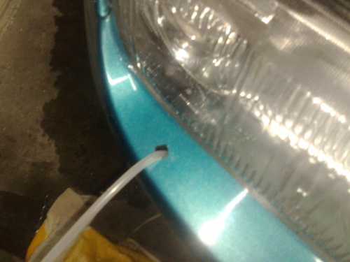 teraz robimy druga dziure w po drugiej stronie i przeprowadzamy przewod cisnieniowy i przy lampe robimy drugi trojnik laczymy oba przewody a ostatni idzie do laczenia sie przewodow od spryskiwaczy szyb.