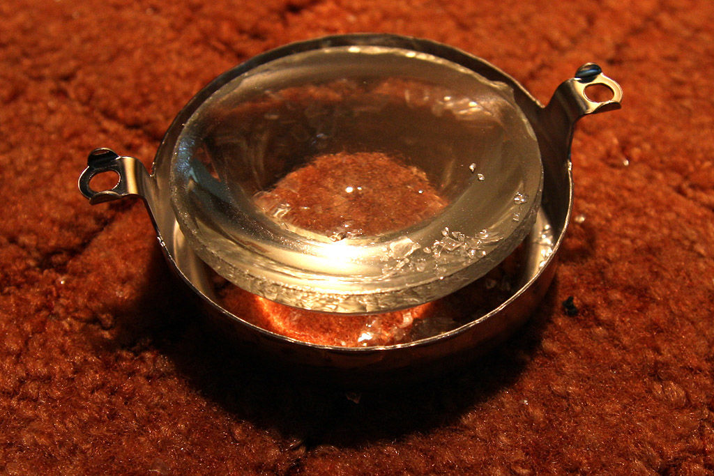 W moim przypadku wewnątrz lapm było mnóstwo drobinek szkła powstałych na skutek ukruszenia rantów soczewki. Miałem to w 3 na 4 lampy więc domniemam, że albo jest to dość powszechne zjawisko w wyeksploatowanych egzemplarzach, albo to ja coś nabroiłem podczas ogrzewania lamp.. Optyka mimo że troszeczkę nadkruszona nadaje się bez problemu do ponownego użytku – obejma soczewki trzyma ją we właściwym położeniu :)