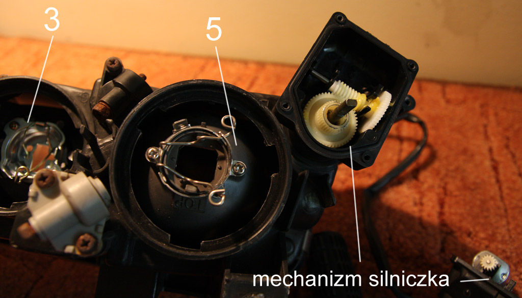 Więc my najpierw odkręcamy śrubę która przytrzymuje silniczek nieruchomo na obudowie. Następnie przekręcamy całość względem czarnej obudowy (30-45 stopni) aż poczujemy większy luz w mocowaniu silniczka. Oznacza to że plastikowe mocowanie na którym silniczek się trzyma jest w pozycji w której będzie można go wyjąć. Teraz wystarczy za pomocą śrubokrętu (klucza) odkręcić do oporu zewnętrzną śrubę regulującą położenie lampy. W efekcie tego działania wewnętrzna część tuby przytwierdzona do śruby(gwintu) silniczka będzie się odkręcać od niego i po chwili uwolni silniczek. Proste.